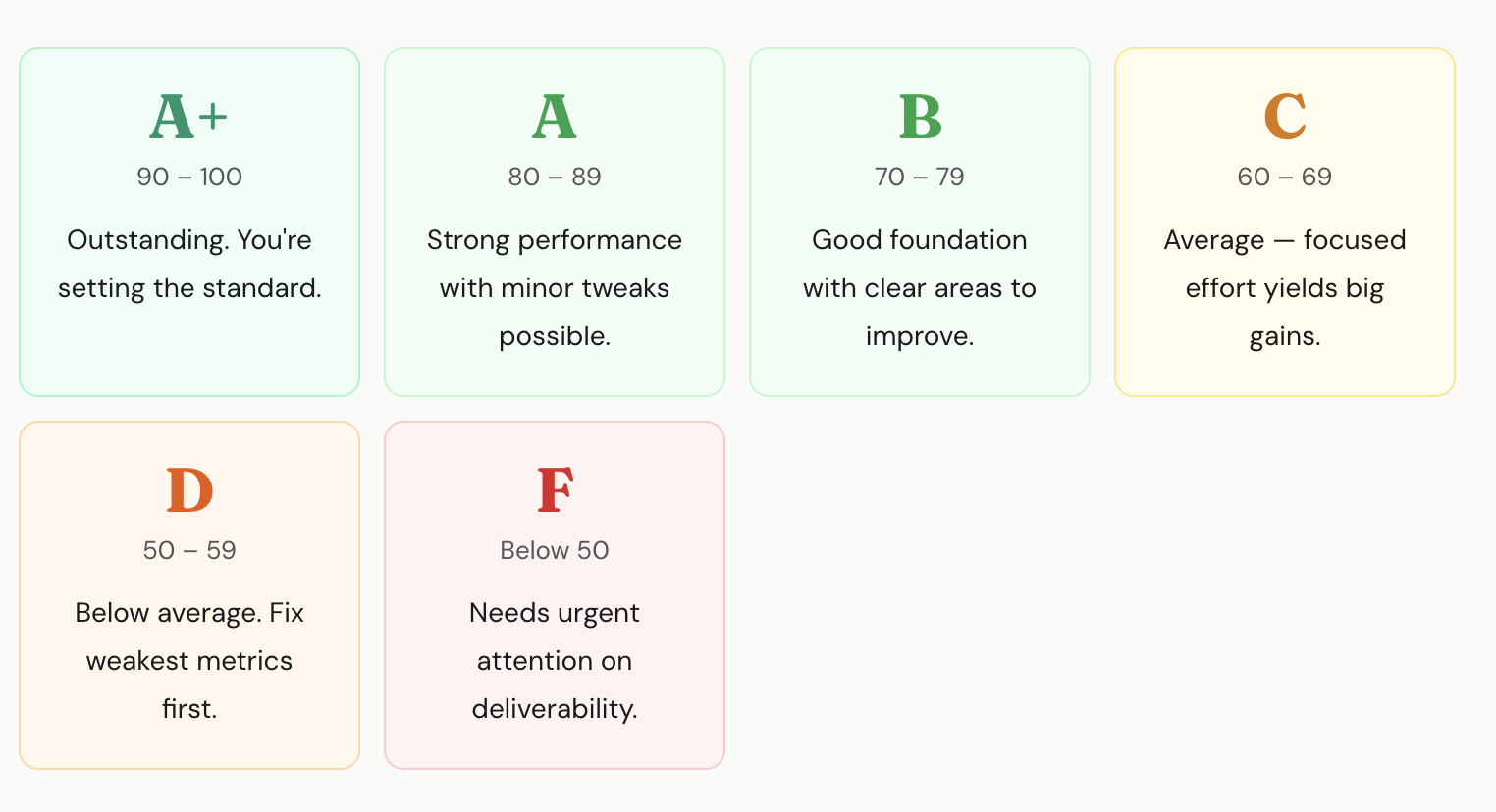 Every AI analysis report includes a performance score out of 100 and a letter grade. The score isn’t just one metric — it’s a weighted blend of six key measurements, each scored against industry benchmarks.